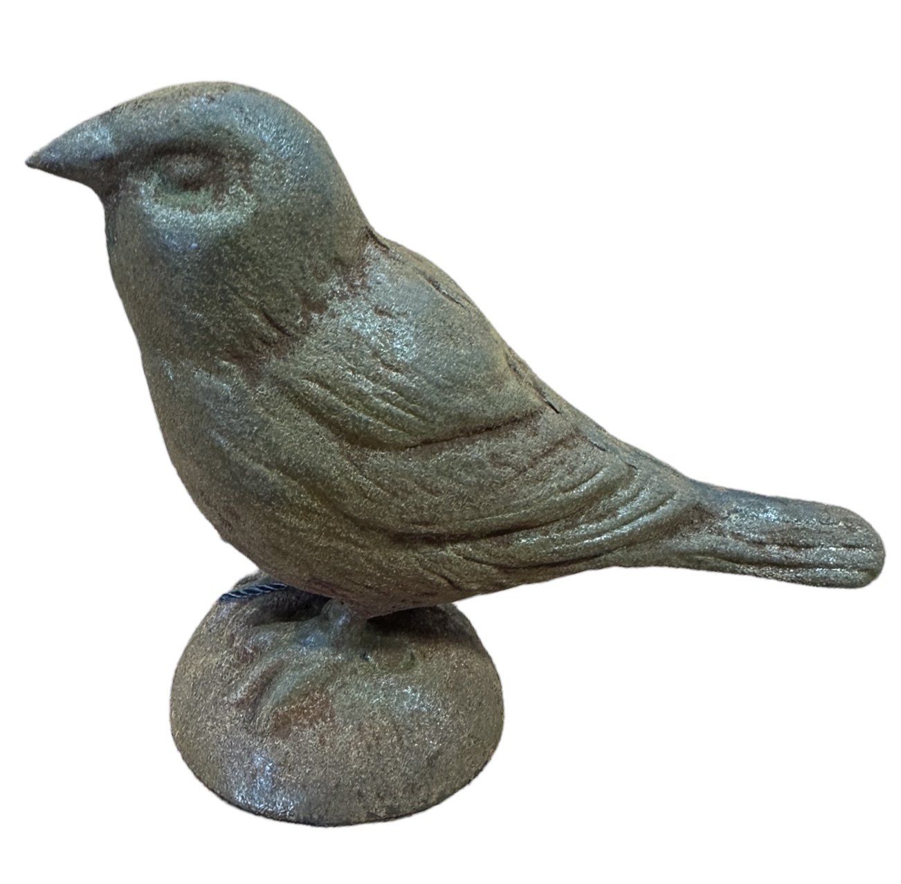 Ruosteen patinoima lintukoriste. Noin kahdeksan senttimetrin korkuinen rautainen koristelintu. Jalustassa huopatassu, ettei naarmuta kalusteiden pintaa.