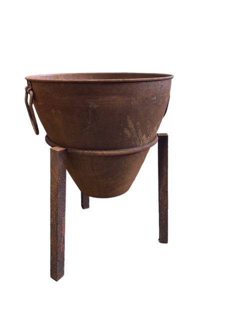 Ruosteen patinoima ruukku telineessä. Ruukun halkaisija 41 cm, ruukun korkeus 42 cm ja telineen korkeus 42 cm. Kokonaiskorkeus, kun ruukku telineessä, 61 cm. Soveltuu parhaiten ulos, tuotteesta saattaa varista irtoruostetta.