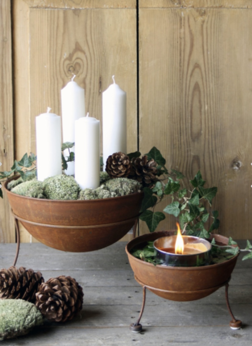 Ruosteen patinoima vati. Halkaisija 20 cm. Vatiin voi tehdä esim. asetelman kukkasista tai kynttilöistä ja luonnonmateriaaleista. Vati on irrallinen, joka on kolmijalkaisessa telineessä. HUOM ! Soveltuu parhaiten ulos, tuotteesta saattaa varista irtoruostetta.
