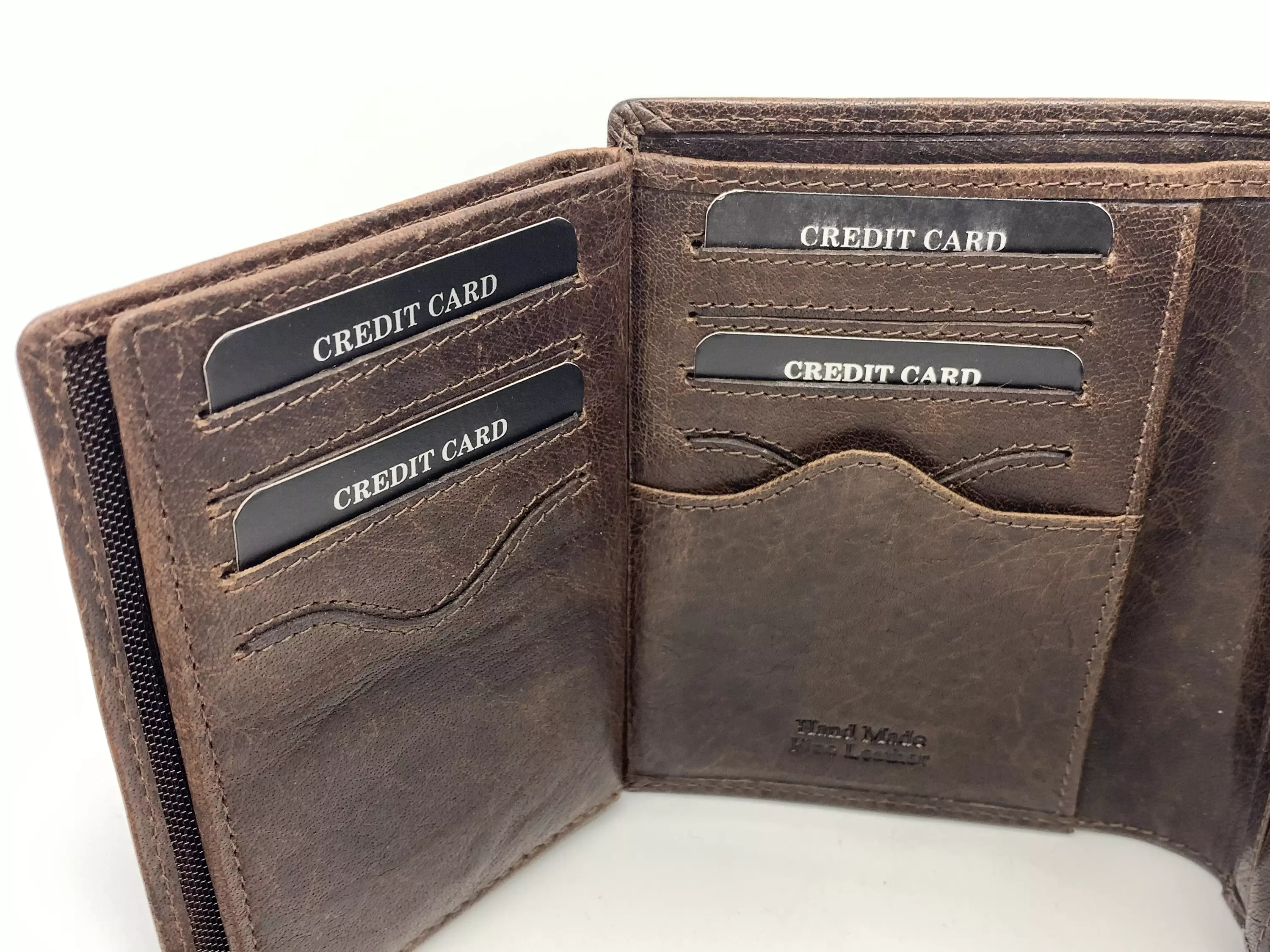 Ruskea nahkalompakko, RFID suojattu. Ruskea RFID-suojattu nahkalompakko, aitoa nahkaa. Pienikokoisessa lompakossa 19 korttitaskua, joista kaksi on läpikuultavaa materiaalia. Lisäksi vetoketjullinen kolikkotasku, sekä kaksiosainen setelitasku. Lompakon mitat n. 10 x 12,5 cm. RFID-suojaus estää korttien laittoman skannauksen ja on suojattu radioaalloilta. Kortti on suojassa kun lompakko on kiinni. Lompakossa suojakalvo on lompakon nahan sisällä.
