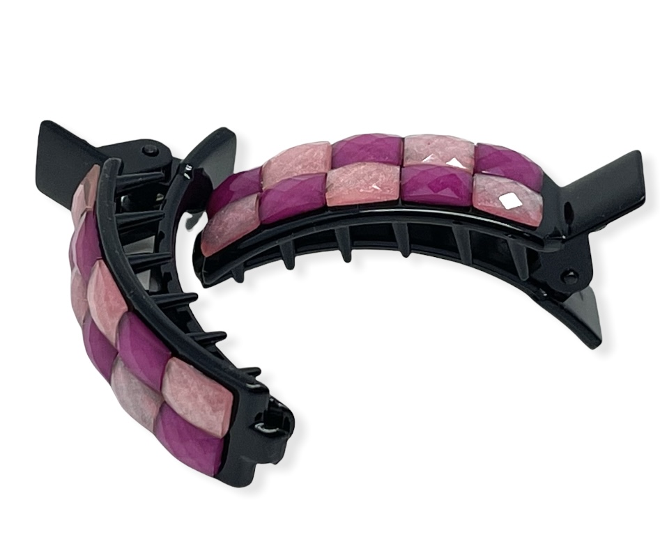Ruutu-klipsupinni. Pinkki-vaaleanpunainen ruutuklipsu, jonka ruudut hohtavat helmiäisenä. Ruudullisen klipsuosan koko 40 x 15 mm. Pakkauksessa 2 pinniä.