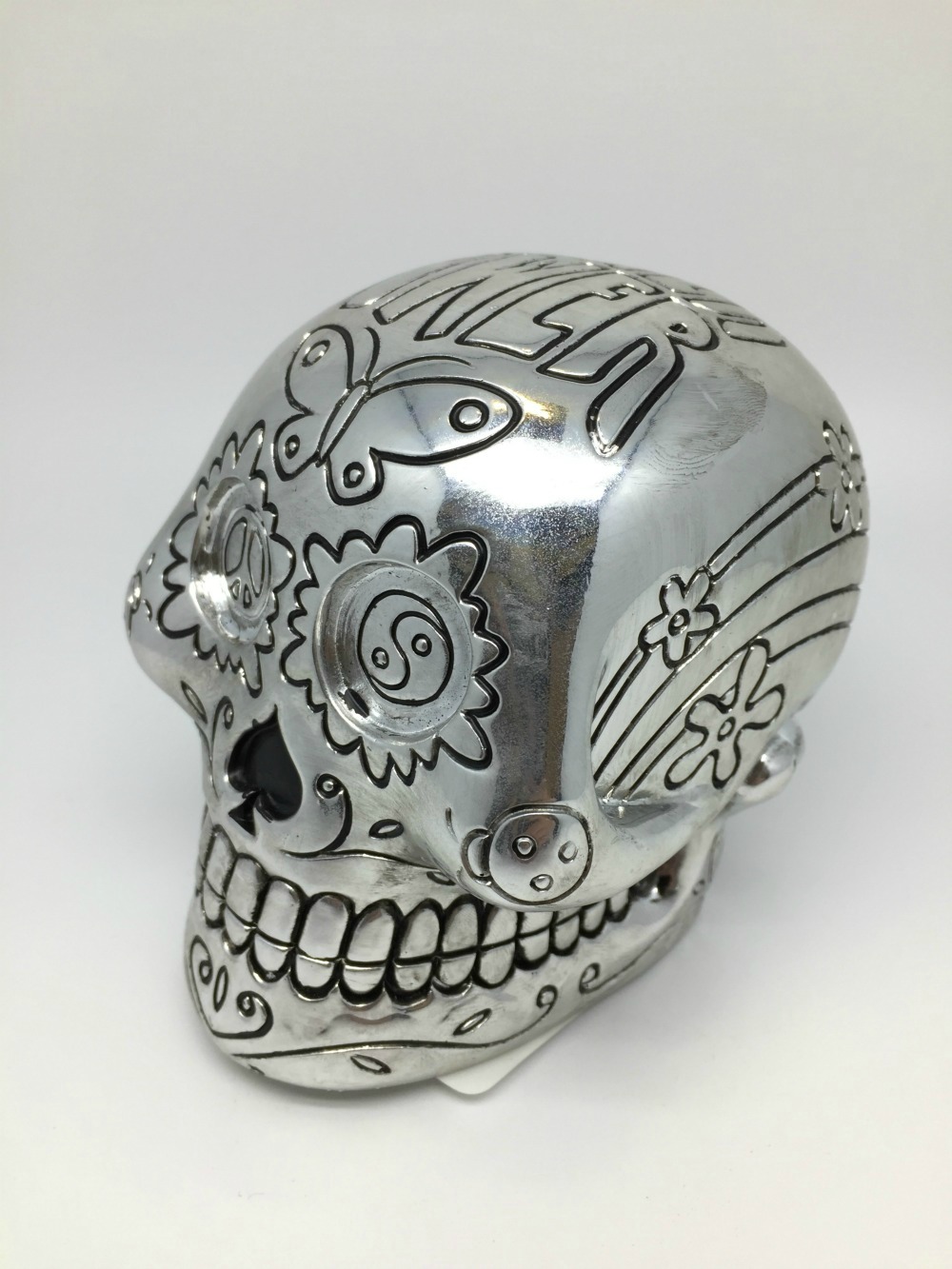 Säästökallo, Sugar Skull Flower Power. Kallon koko 9 x 8 x 6 cm. Tyhjennystulppa pohjassa.