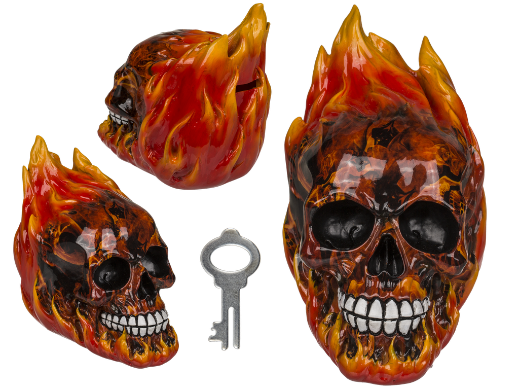 Säästölipas, Liekkikallo. Upea pääkallo liekeissä ! Mukana avain, jottei tarvitse tätä komeutta vasaralla avata. Materiaali polyresiinia, koko n. 16 x 16 cm.