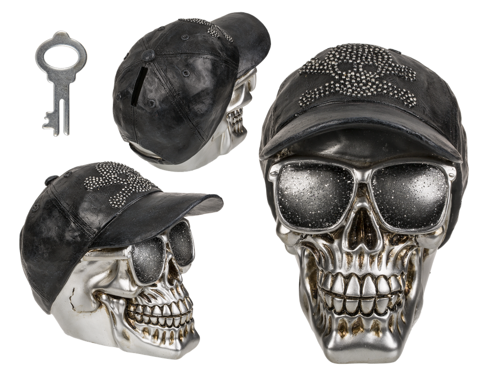 Säästölipas Lippiskallo. Cool ! Metallinhohtoinen kallo, jolla aurinkolasit ja musta lippis. Mukana avain, jottei tarvitse murtautua rikkomalla. Materiaali polyresiinia, koko n. 16 x 13 cm.