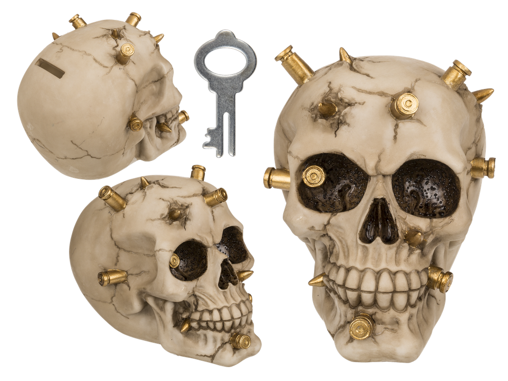 Säästölipas Luotikallo. Kallo, jonka kohtalo on silminnähtävissä ! Mukana avain, jottei kalloa tarvitse kiduttaa yhtään enempää. Materiaali polyresiinia, koko n. 15,5 x 12 cm.