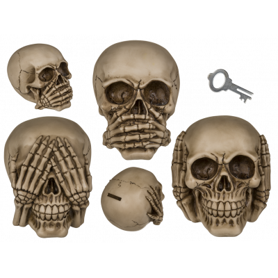 Säästölipas Three Monkeys. Kolme erilaista ilmettä / lajitelma: See No, Hear No, Speak No. Polyresiiniset kallot, koko n. 15 x 10 cm.