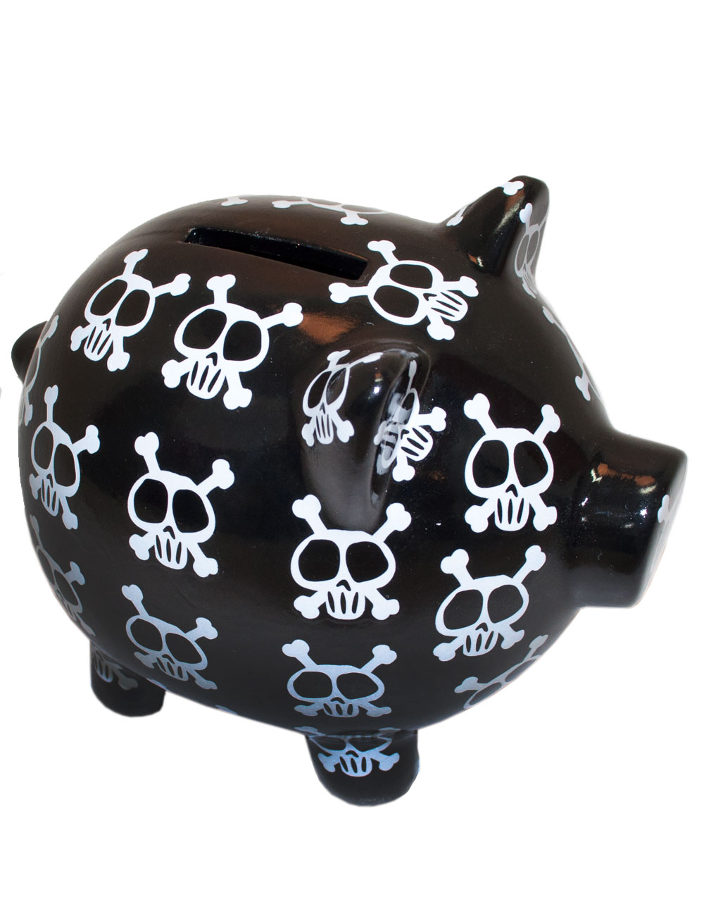 Säästöpossu, Pääkallo. Keraamisen säästöpossun korkeus 16 cm ja pituus 18 cm. Possun selässä reilun kokoinen täyttöaukko ja possun vatsassa tyhjennysaukko. Possu on erittäin helppoa tyhjentää, ehkä jopa liian helppoa viedä lasten karkkirahat. Jaloissa kumitassut, joka takaa sen, että possu pysyy hyvin paikoillaan liukkaallakin alustalla.
