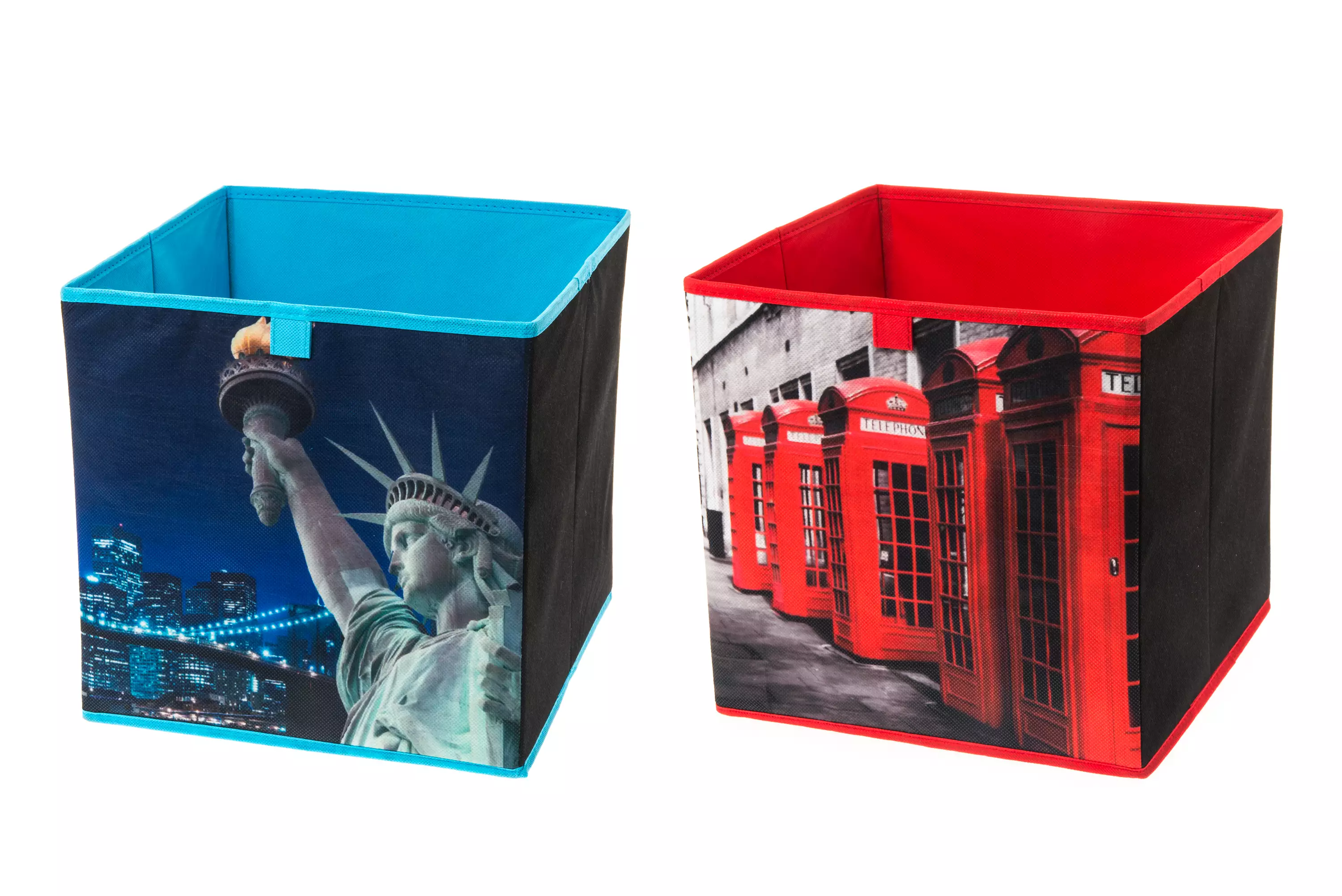 Säilytyslaatikko, taitettava, erilaisia. Taitettavan laatikon koko 28 x 28 x 28 cm. Punaisessa laatikossa Lontoo aiheinen kuva, sinisessä New York.