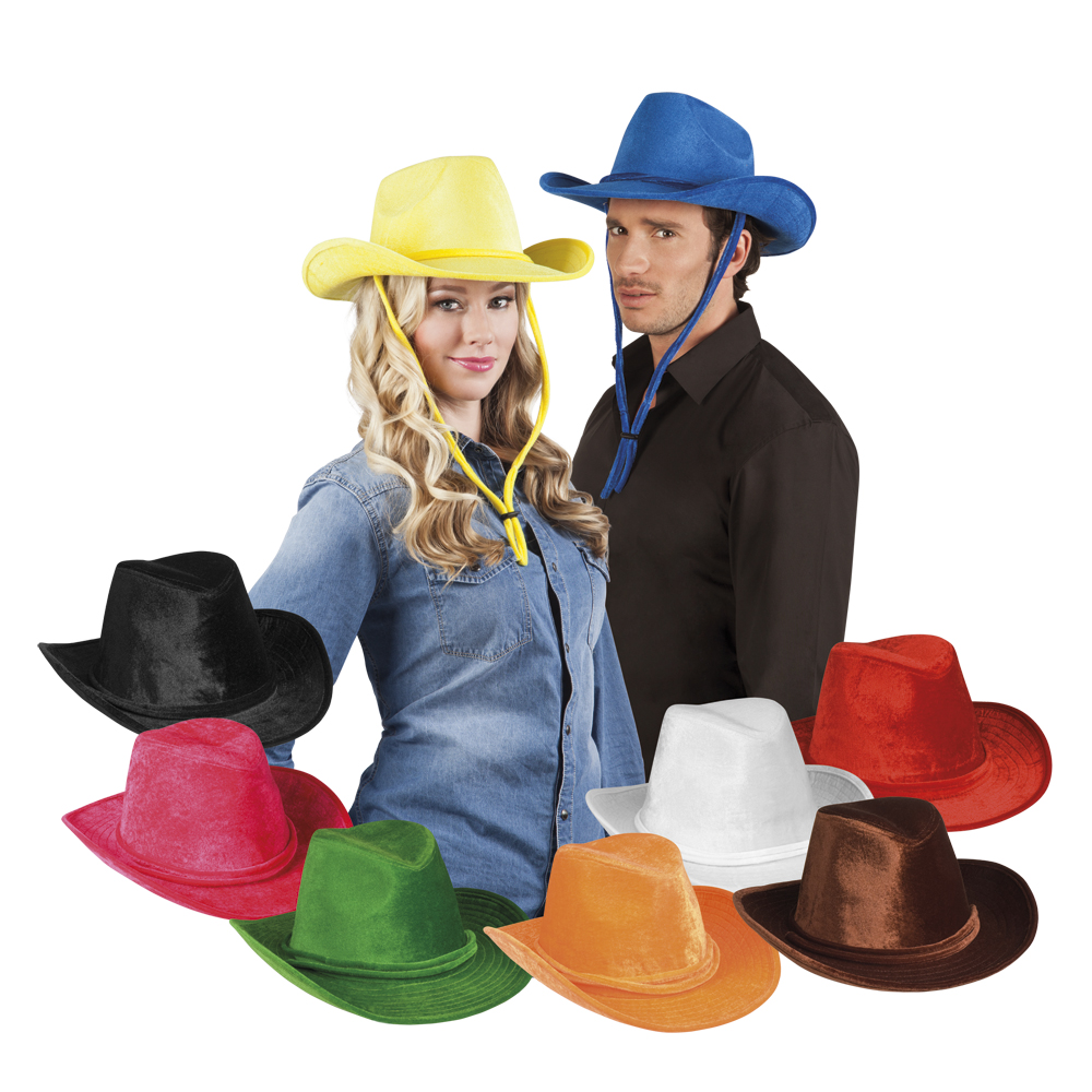 Samettihattu. Cowboy-hattu tyylikästä kiiltäväpintaista sileää samettia. Hatun ympäri kiertää samettinen nyöri, jolla saa myös solmittua hatun tarvittaessa leuan alta. Yksi koko. 100 % polyester.