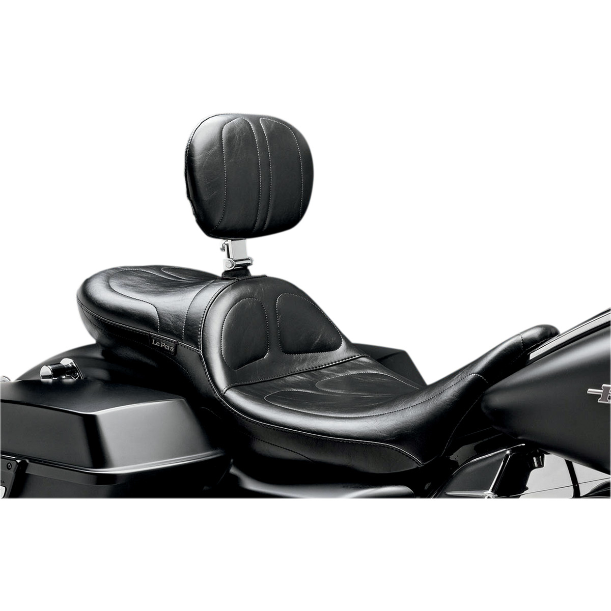 Comfortable seat that retains a custom look Designed for the taller rider who needs more room to move back while still giving the passenger comfort Gives the driver an extra 2" of leg room Special contours give good support while allowing unrestricted movement Molded one-piece foam foundation covered with premium-grade black vinyl on a 16-gauge powder-coated steel base plate Seat bottom carpeted to protect the fender Made in the U.S.A.