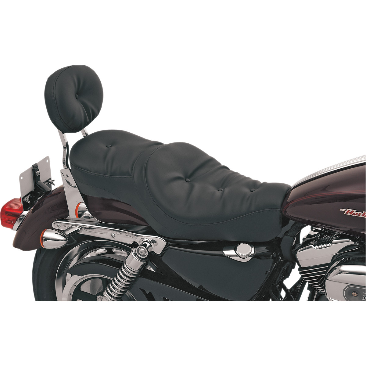 Mild stitch style features solar-reflective leather in the seating area and automotive-grade vinyl on the sides; patented process reduces surface temperature by as much as 25°F for a cooler seat, higher durability and longer life over conventional leather or vinyl All feature a molded polyurethane foam interior that retains shape Thermoformed ABS-plastic seat base for perfect fit Fully carpeted bottom with rubber bumper to protect paint Instructions and all necessary hardware included Fit with all Drag and most H-D sissy bars 1/2" lower than stock seat Made in the U.S.A.