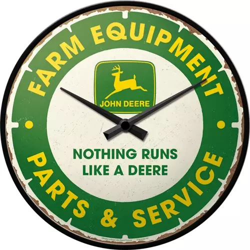 Seinäkello John Deere, Parts & Service. Kellossa on tukeva metallikuori ja korkealaatuinen kaareva lasi. Kvartsikoneisto toimii yhdellä AA-paristolla (ei sisälly pakkaukseen). Toimitetaan tyylin mukaisessa kartonkilaatikossa. Kellon halkaisija on n. 31 cm.