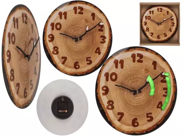 Seinäkello Tree Slice. Puunrungosta sahatun näköinen lasitaulu, jossa viisarina versoava oksa. Mitat 27 X 30 X 4 cm. Toimii yhdellä AA-paristolla (ei sisälly pakkaukseen).