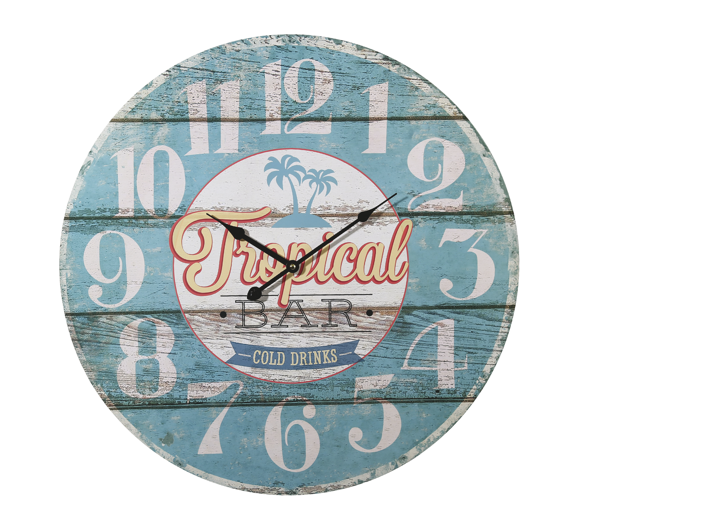 Seinäkello, Tropical Bar, 58 cm. Seinäkellon halkaisija 58 cm, materiaali MDF-levyä. Toimii yhdellä AA-paristolla, ei sisälly pakkaukseen.