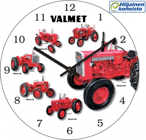 Seinäkello, jossa on kuuden Valmetin kuvat. Kuvissa on traktorimallit 15, 20, 33D, 359D, 361D ja 565. Tässä on nostalgiaa! Kellotaulun halkaisija 30 cm Kellotaulu lasia Hiljainen, lähes äänetön koneisto Toimii yhdellä AA-sormiparistolla (ei mukana) Kellolla vuoden takuu
