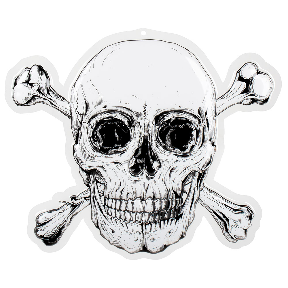 Seinäkoriste Piraattikallo 42 x 50 cm. Halloween. Seinäkoriste muovikalvoa, koko 42 cm x 50 cm. Koristeeksi sellaisenaan, tai mikseipä kallon taakse voisi laittaa vaikka pienet led-valot.