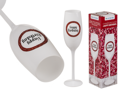 Shamppanjalasi, Happy Birthday. Valkoinen shamppanjalasi punaisin glitterkivin ja onnittelutekstein. Lasin mitat n. 25 x 7 cm, vetoisuus n. 150 ml.