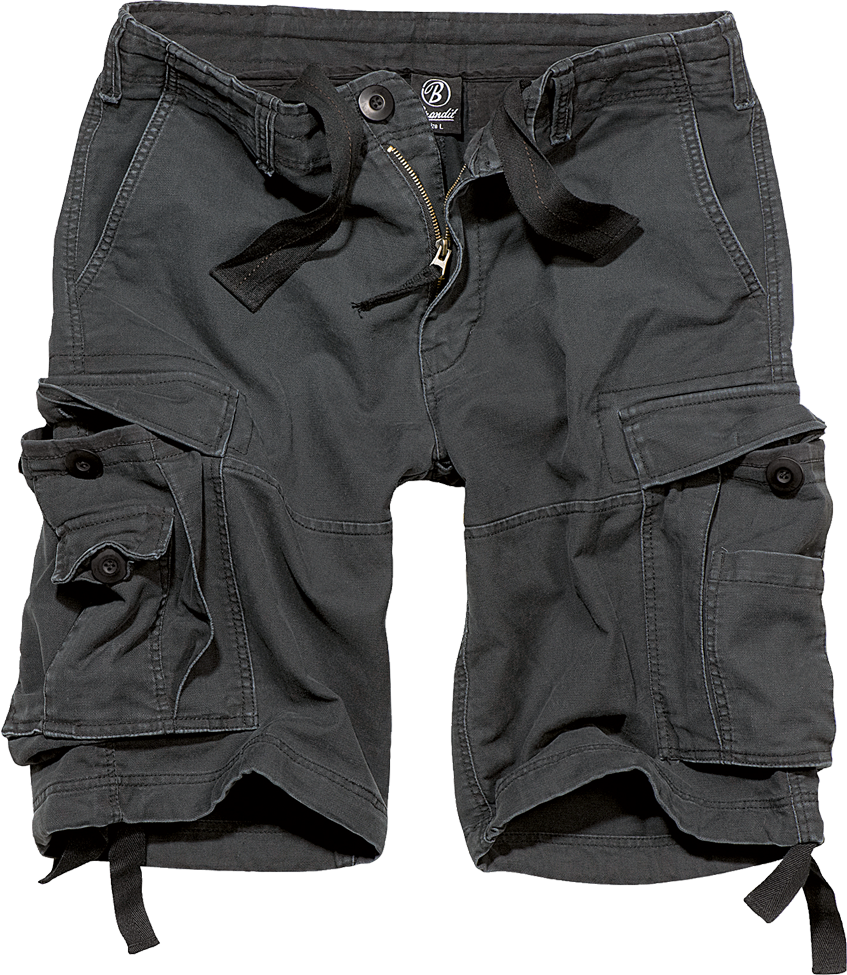 Shortsit, Brandit Vintage Shorts, Black. Branditin reisitaskushortsit, paksumpaa 100 % puuvillaa. Etuhalkio vetoketjulla ja napilla, 7 vyölenkkiä, vyötäröllä ja lahkeensuissa kiristysnauhat. Taka- ja reisitaskujen läpät piilonapituksella. Molemmissa reistaskuissa lisäksi päälleommellut pikkutaskut.