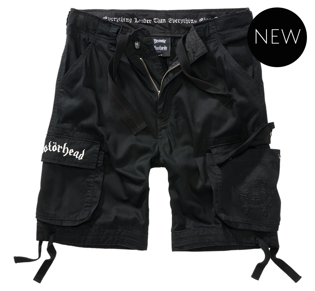 Shortsit Motörhead Urban Legend. Mustat reisitaskushortsit, joissa mahtavia yksityiskohtia ! Vasemmassa reisitaskussa upea 3D-printti, oikean reisitaskun läpässä valkoinen brodeerattu Motörhead-teksti. Napissa on motörheadin logo, vyötärökaitaleen sisäpuolella on printattuna teksti "Everything Louder Than Everything Else". Vasemmassa takataskussa on Motörhead-pinssi, reisi- ja takataskuissa neppariläpät. Lahkeensuissa kiristysmahdollisuus. Materiaali miellyttävä, kevyt 100 % puuvilla.