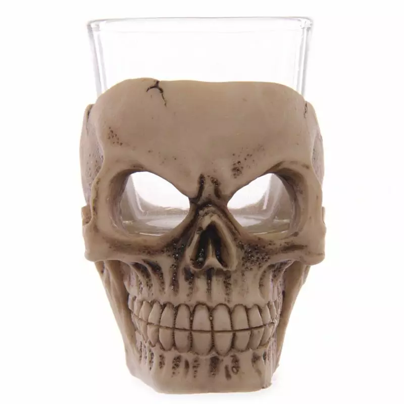 Shottilasi Gruesome Skull, Halloween. Shottilasi, jossa resiinistä valmistettu pääkallokuori. Lasin mitat 5 x 7 x 5 cm. Ei kuumille juomille.