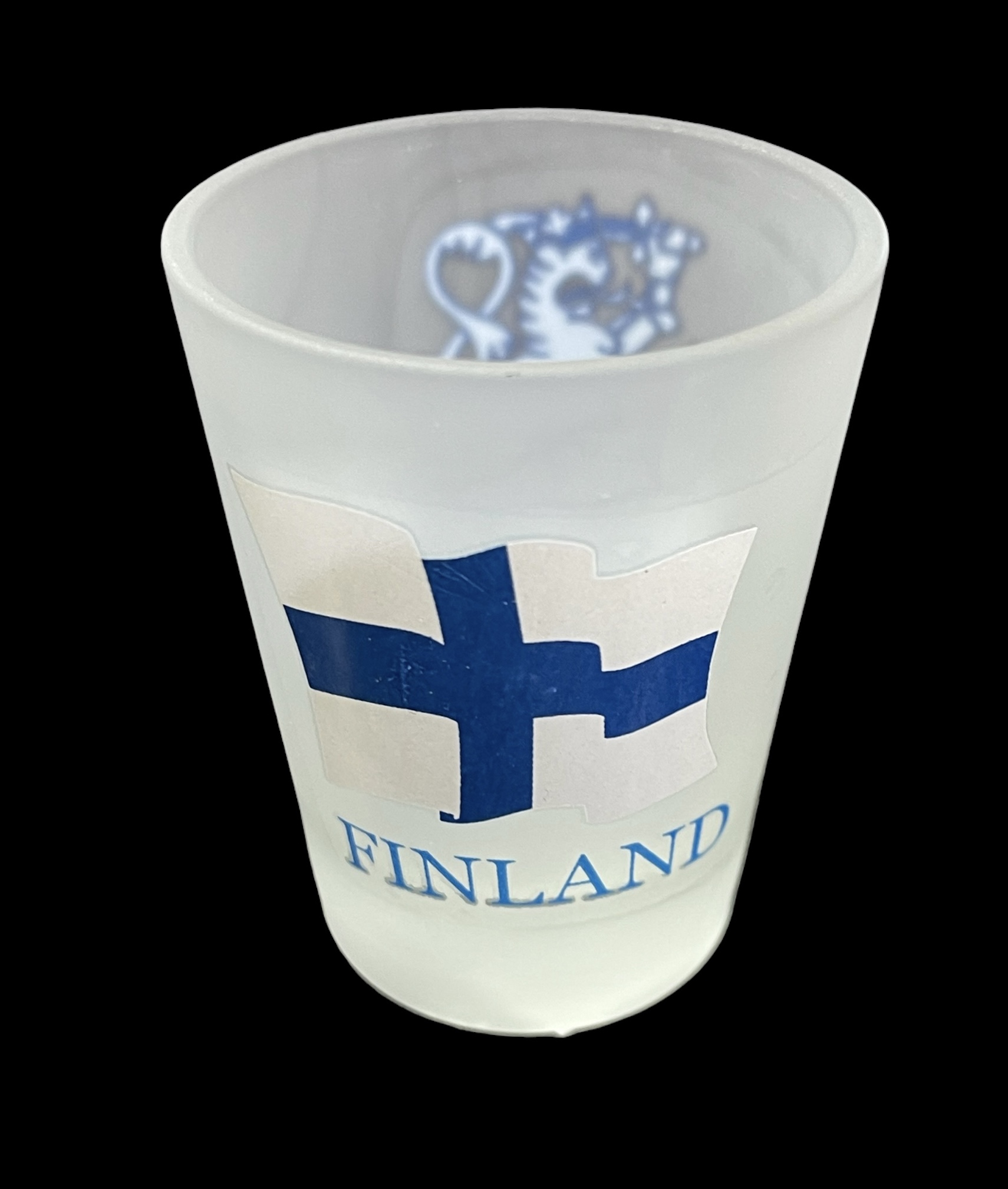 Shottilasi, Suomi Huurre. Shottilasi himmeätä huurrelasia. Lasin toisella puolella kuvassa liehuva Suomenlippu ja teksti FINLAND, sekä toisella puolella Suomileijona sekä teksti FINLAND. Lasin korkeus 60 mm ja lasin suuaukon halkaisija 50 mm.