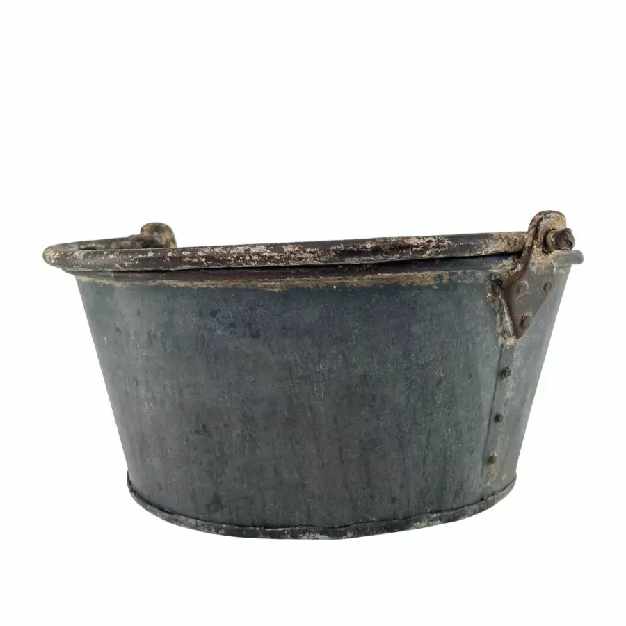Sinkkiruukku / -ämpäri ajan patinalla. Vanha, rustiikkinen sinkkiastia. Mitat: korkeus n. 13 cm ja yläreunan halkaisija n. 30 cm.