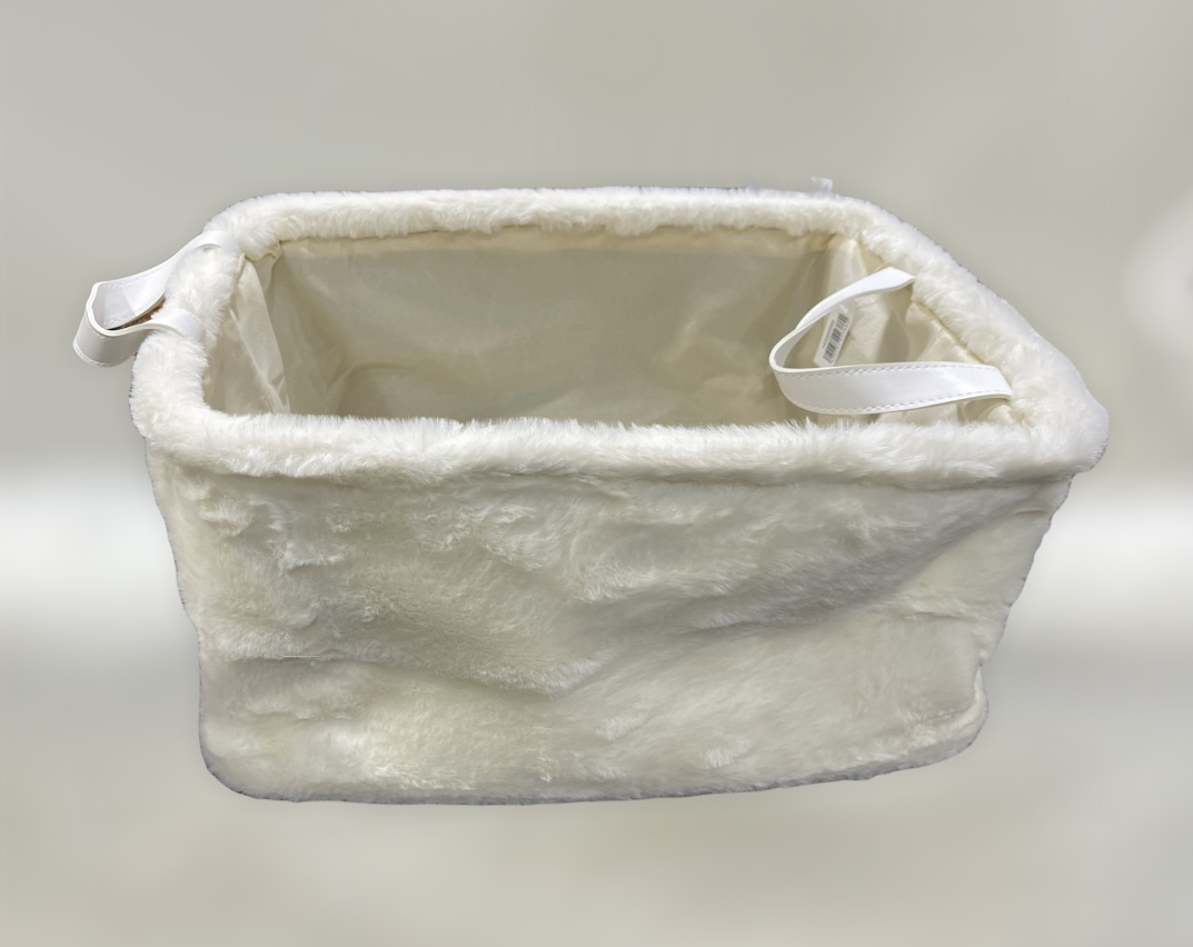 Sisustuskori Pörrö suorakaide, valkoinen. Mitat n. 34 x 23 x 20 cm. Korissa ohut kankainen vuori, ja molemmissa päissä tukevat valkoiset kantokahvat. Suloisen pehmoinen yksityiskohta sisustukseen, joka on myös samalla käytännöllinen säilytyskori. Kerää vaikka kauneimmat huivisi koriin eteiseen odottamaan lähtöäsi.