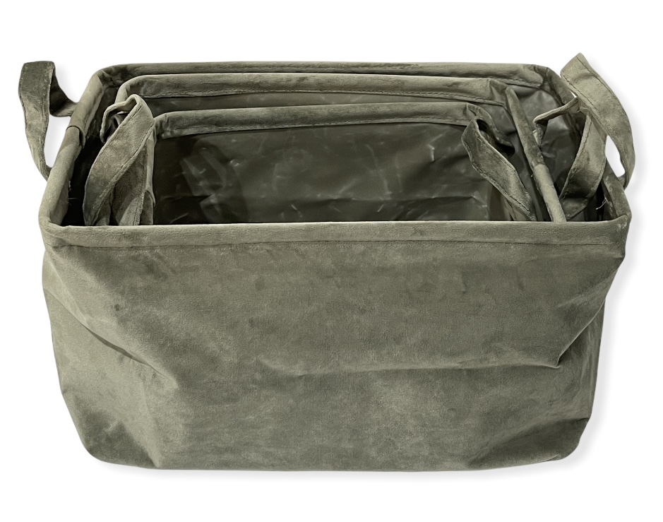 4living sisustuspussukka, 3-setti. Vihertävänharmaa samettipintainen sisustuspussukkasetti, kolme eri kokoa. Pussukan sisäpinta on muovitettu, joten se voi toimia vaikka kosmetiikan säilytyksessä. Isoimman pussukan mitat n. 25 cm x 35 cm, korkeus n. 20 cm, keskimmäisen 24 cm x 30,5 cm, korkeus 20 cm, ja pienimmän 19 cm x 27 cm, korkeus 15 cm. Nyt vaate- ja kylpyhuoneet järjestykseen !
