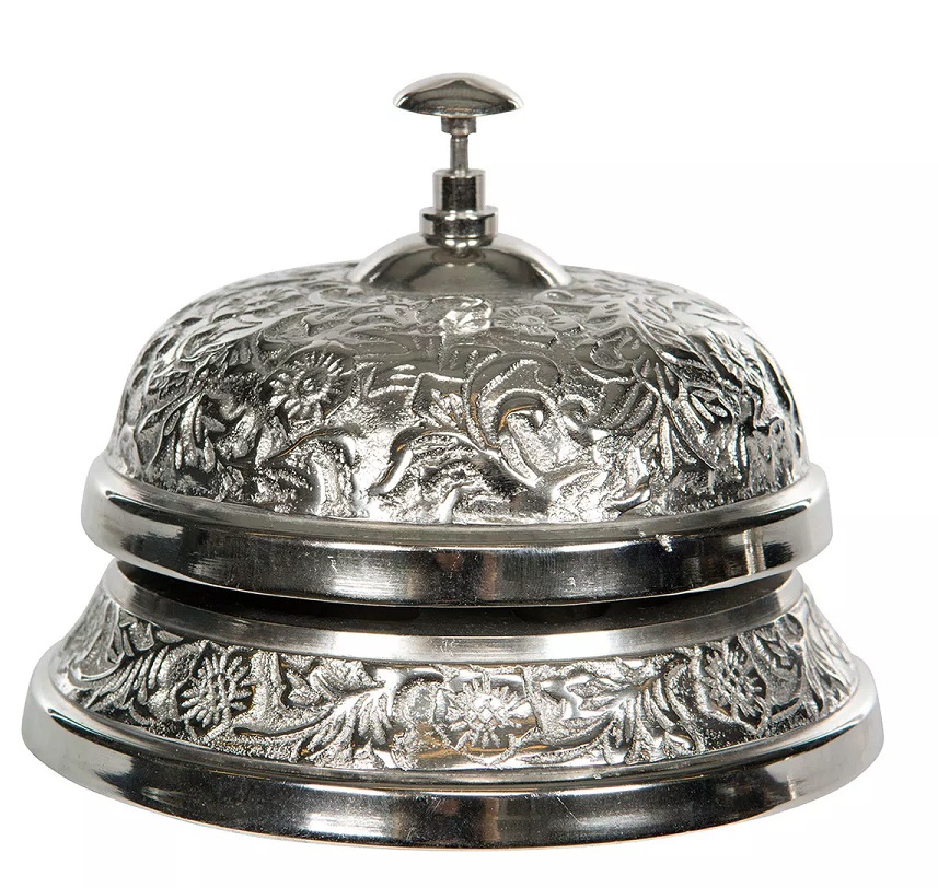 Soittokello, antiikkihopea. A Lot Decoration. Tyylikäs soittokello baaritiskille, keittiöön, tai vaikkapa yöpöydälle. Metallisen kellon mitat 14 x 12 cm. Käsintehty.