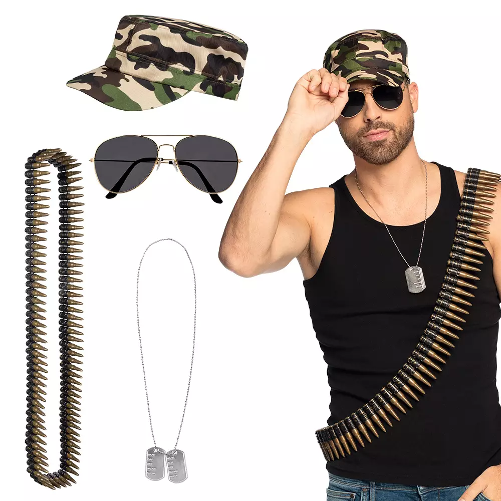 Sotilas asusteet, halloween. Kattava roolisetti sotilaalle. Pakkaus sisältää maastokuvioisen säädettävän lippiksen, panosvyön (muovia), tunnistelaatat ketjussa sekä aurinkolasit.