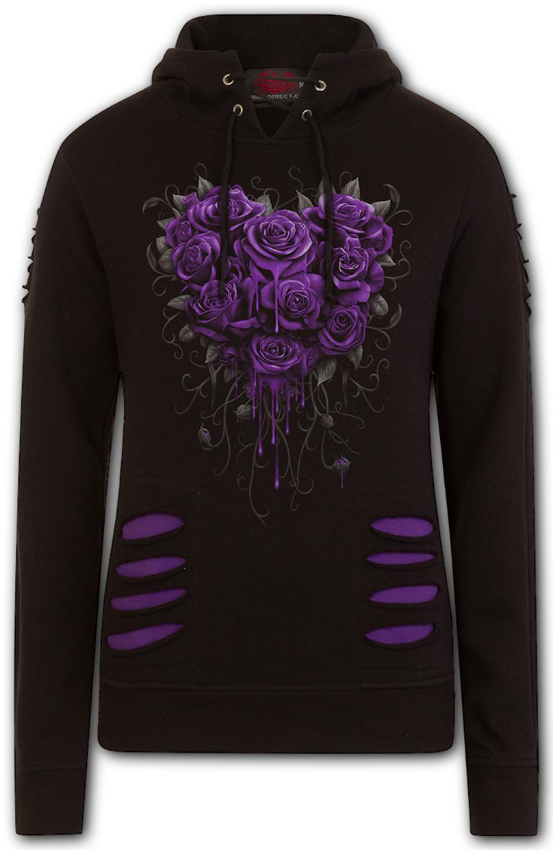 Spiral Huppari, Bleeding Heart. Musta huppari lilan värisillä tehosteilla. Materiaali 100 % puuvilla, pesu max. 40 asteessa.
