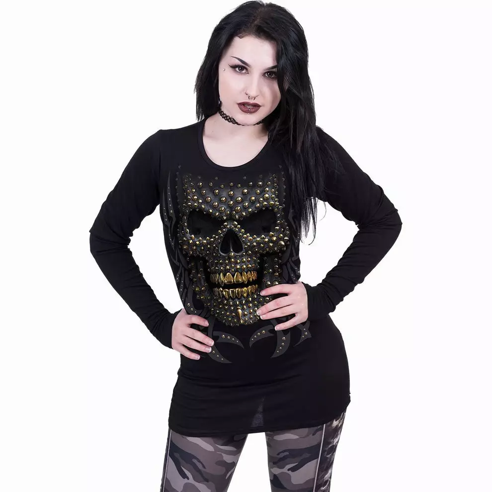 Keskiyön mustemusta kalpeus peittää kallon pimeydessä, jota korostavat heimokaiverrukset ja sulan kullan hohto. Kuolema ei löydä lohtua kuolemanjälkeisen elämän rappeutuvista omaisuuksista.