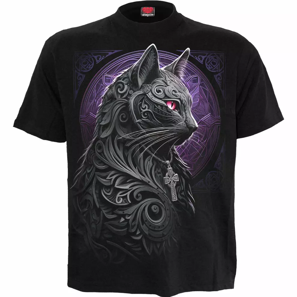 Kummittava kuva kissasta, mustana kuin sitä ympäröivä yö, täynnä kelttiläisiä koristeita, jotka kehystävät sen kasvoja ja luovat loistokkuutta ja tyyneyttä. Kissanystävien kannattaa lisätä tämä kaunis vaate kokoelmaansa. Musta etuprintti-t-paita on valmistettu huippulaatuisesta 100 % puuvillasta, jerseystä, ja sen valmistuksessa on käytetty ihoystävällisiä, atsovapaita ja reaktiivisia väriaineita.
