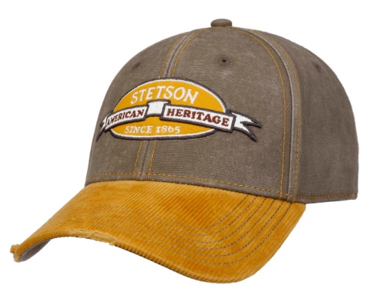Stetson Baseball Cap Vintage Distressed. Ruskea lippis, jossa kaareva, sinapinkeltainen vakosamettilippa. Säädettävä koko, materiaali 100 % puuvilla.