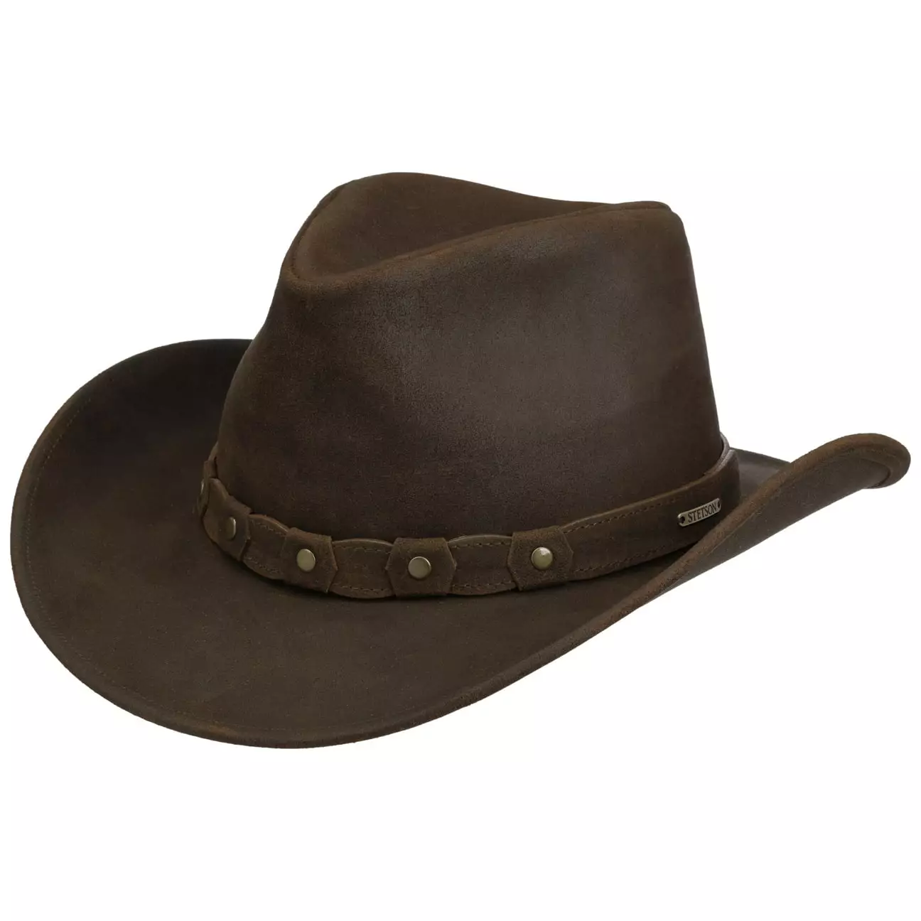 Stetson Calf Split Western, ruskea. Nahkainen Cowboy-hattu, ruskeaa naudannahkaa, vuori 100 % puuvillaa. Hattuosan korkeus n. 12 cm, lierin leveys n. 7 cm.