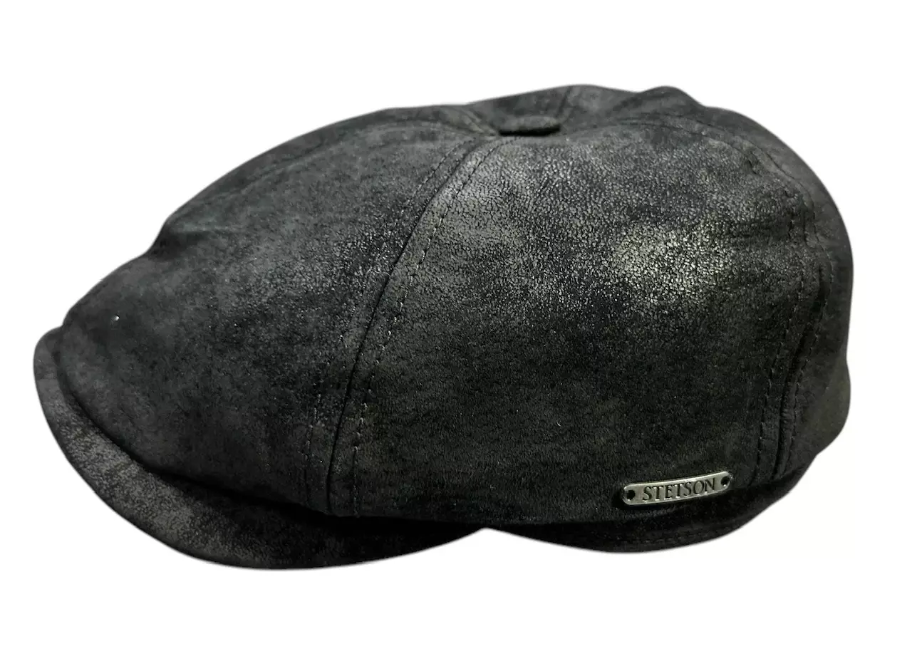 Stetson nahkalätsä Black. 6-paneelinen vintage-tyylinen nahkalätsä, jossa päälaella pisteenä ii:n päällä nahalla päällystetty nappi. Nahkapinta on käsitelty antiikkinahan näköiseksi. Vuori 100 % puuvillaa.