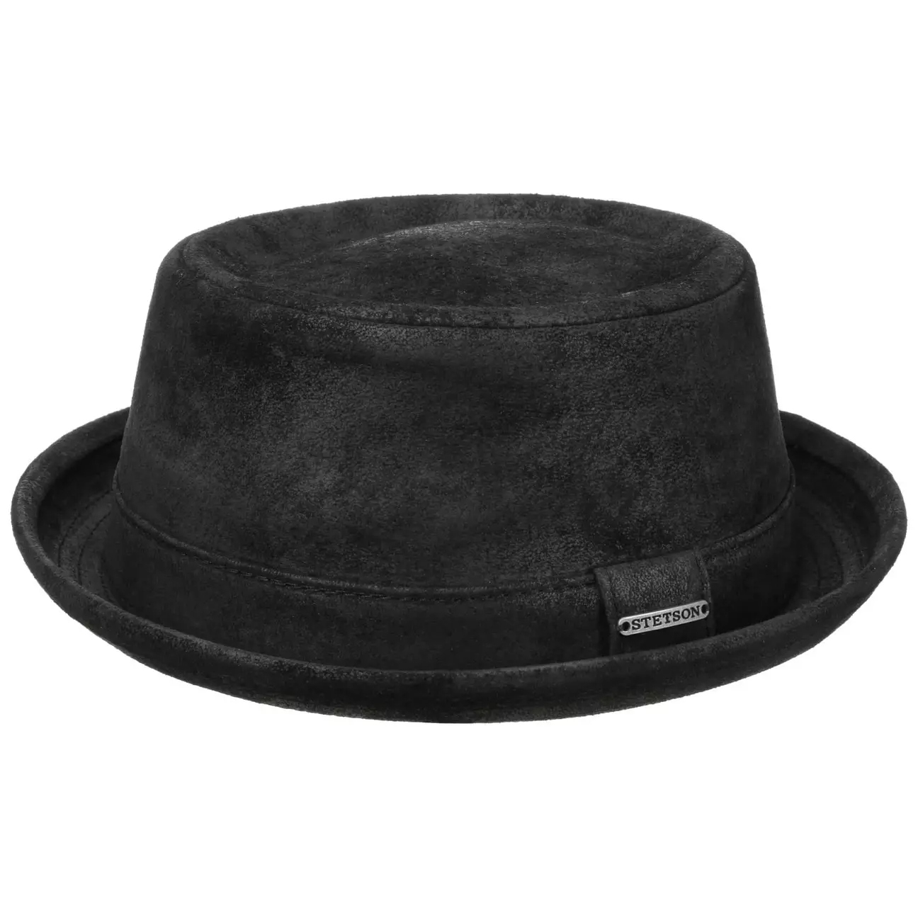 Klassinen Pork Pie-hattumalli, Lierin leveys n. 4 cm, hattuosan korkeus n. 10 cm. Päällisen materiaali 100 % nahkaa, vuori 100 % puuvillaa.