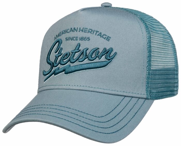 Stetson Trucker Cap American Heritage Classic, vaaleansininen. Suosittu Trucker Cap-mallisto on "one size fits most"-tyyliin säädettävissä takaosastaa kokoihin 55-61 cm. Takaosa ilmavaa polyesteriverkkoa.
