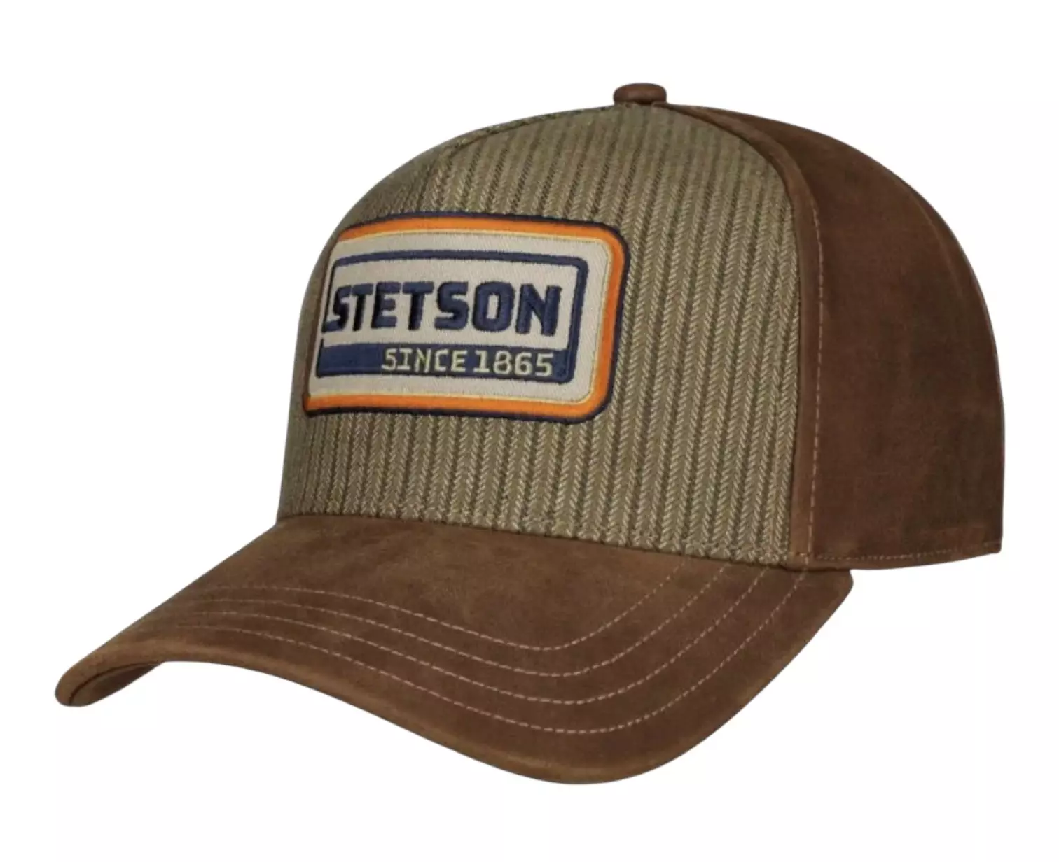 Stetson Trucker Cap Cotton Linen Stripe. Lipan ja takaosan materiaali nahkaa, muut osat puuvillaa ja pellavaa.