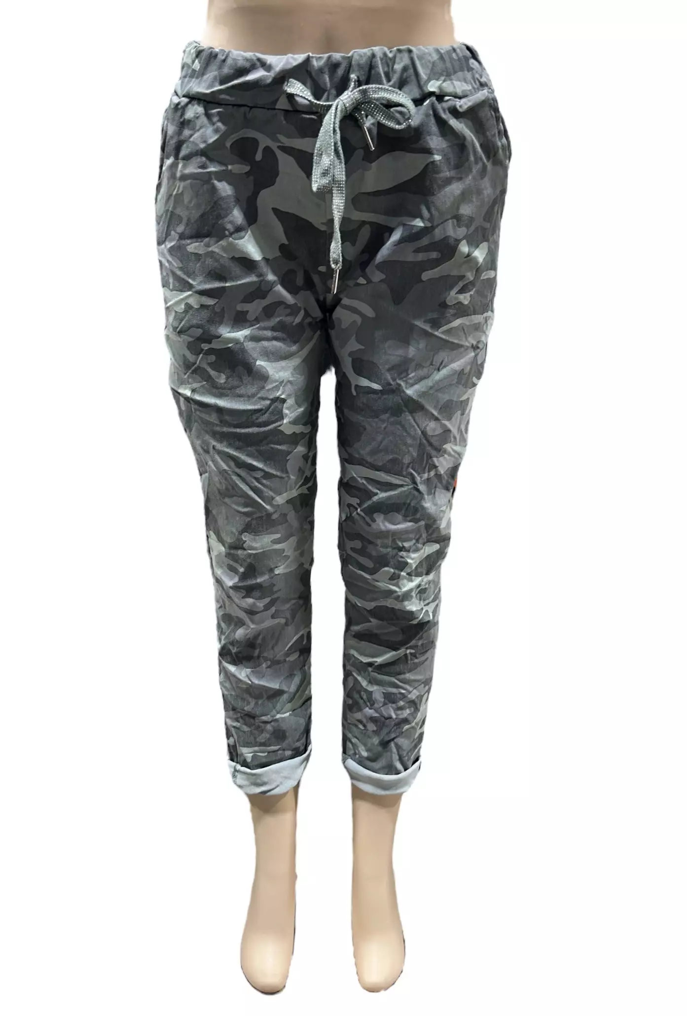 Stretch- housut vaaleanvihreä camo. Mukavat, rennot ja joustavat naisten Stretch-housut, joissa kuminauhavyötärö ja nyörikiristys. Materiaali 60 % viskoosi, 35 % polyesteri, 5 % elastaani. Saatavana kahdessa koossa, mutta koska ovat hyvin joustavia, sopii useammalle. XL-koko sopii S-XL-kokoisille ja XXL sopii myös isommille vartalonmallista riippuen.