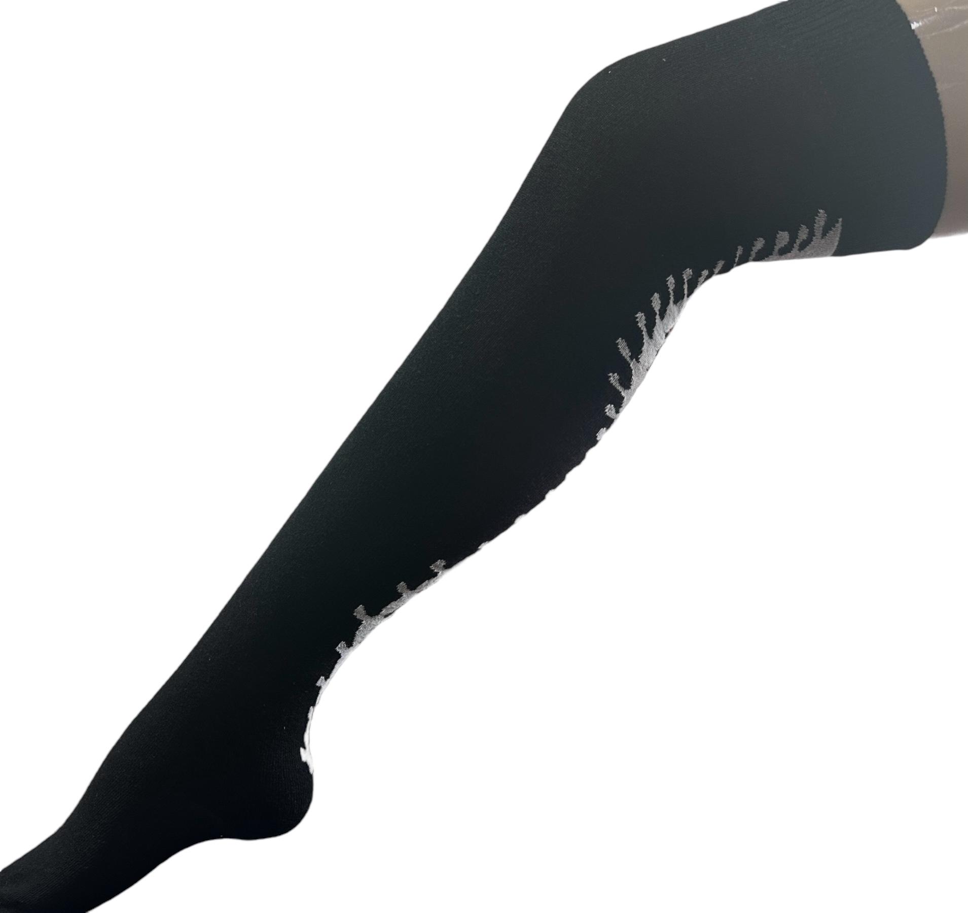 Pitkät sukat 38/41, Ranka. Mustat ylipolven sukat, joissa pohkeessa kiemurtelee valkoinen ranka-kuvio. Materiaali 85 % puuvilla, 13 % nailon ja 2 % elastaani.