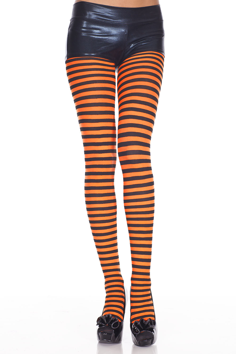 Sukkahousut, oranssimustaraita. Tiheäraitaiset sukkahousut. Yhdenkoon sukkahousut, oranssimustaraidalliset. 70 denier, 100 % nylon.