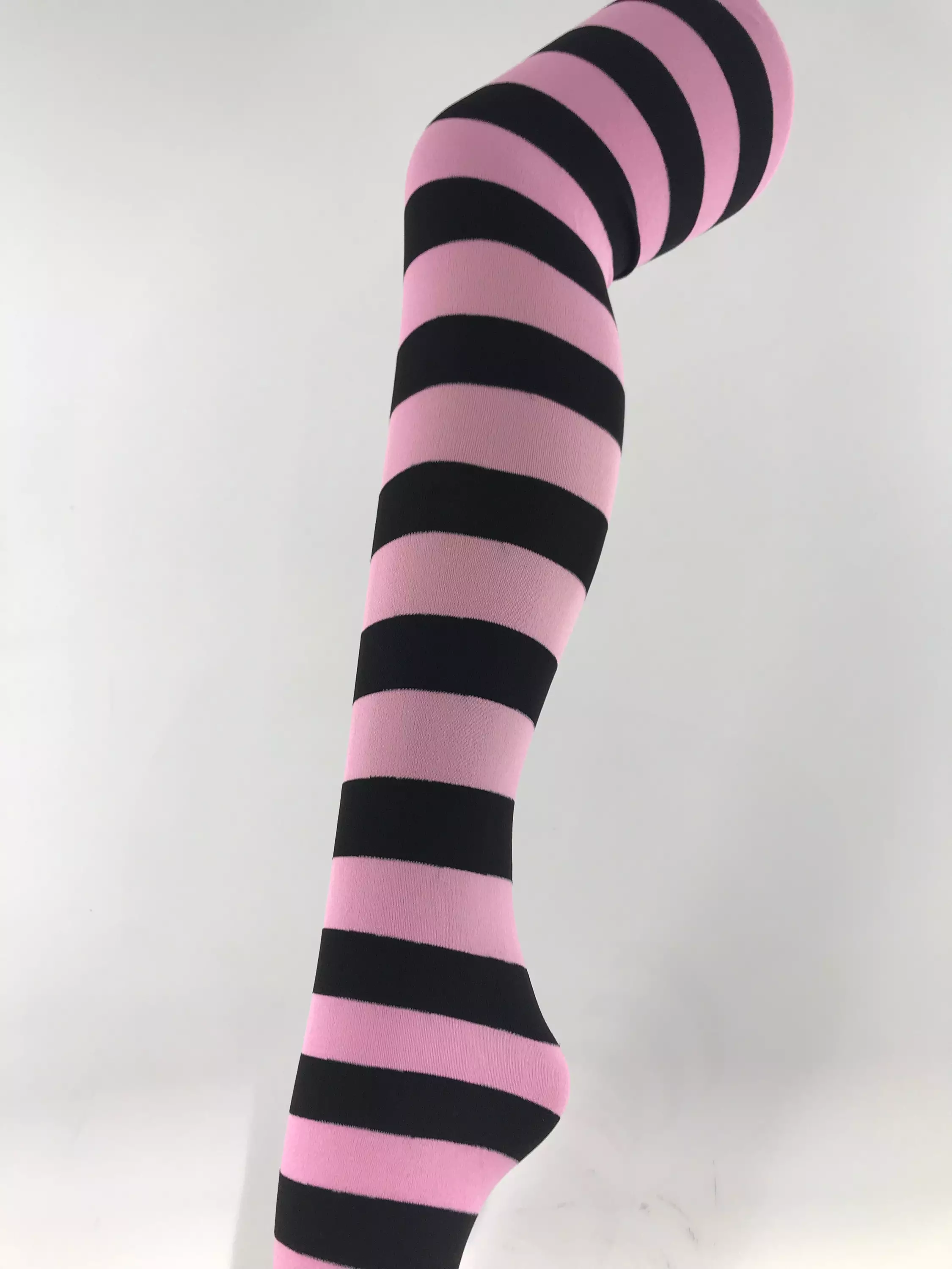 Sukkahousut, pinkkiraita. Yhdenkoon sukkahousut, pinkkimustaraidallinen. 70 denier, 100 % nylon.