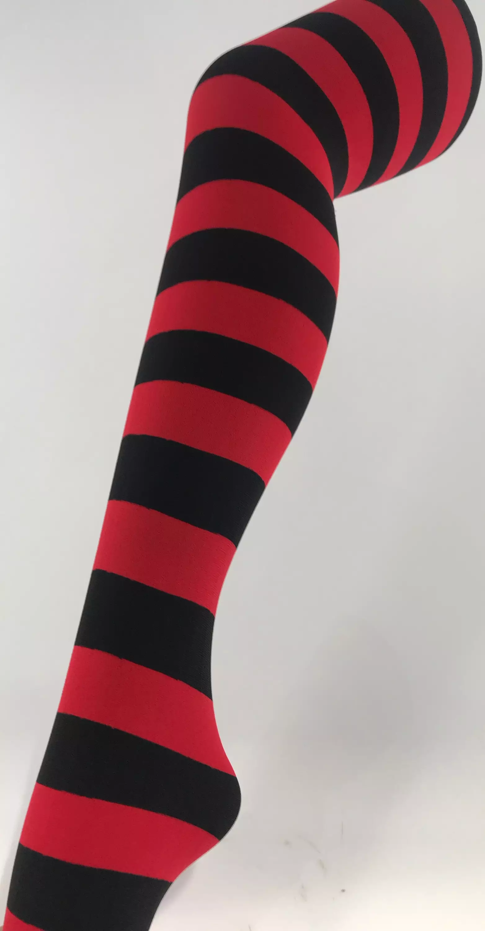 Sukkahousut, punaraita. Yhdenkoon sukkahousut, punamustaraidallinen. 70 denier, 100 % nylon.
