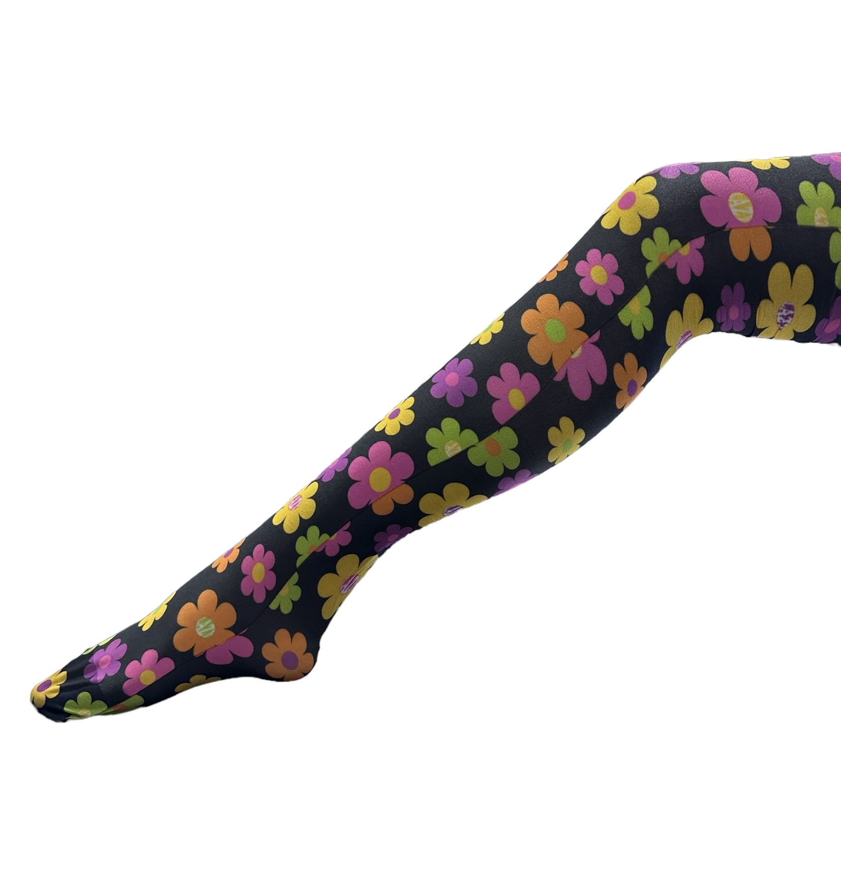 Sukkahousut Retrokukka. One Size Fits Most. Mustat yhdenkoon sukkahousut värikkäillä kukilla. Materiaali 94 % nailon, 6 % elastaani.