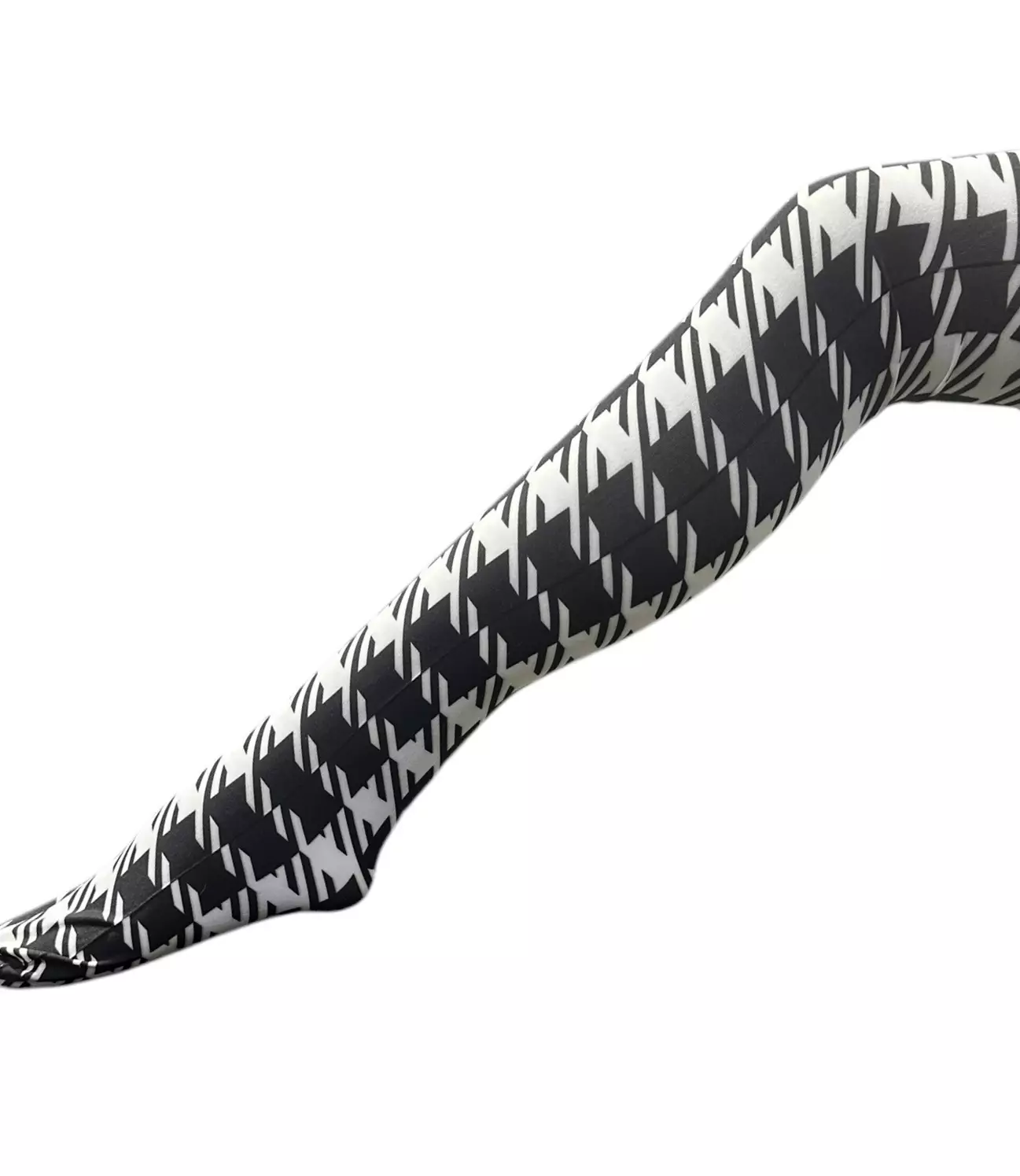 Sukkahousut valkoinen kukonaskel. One Size Fits Most, yhdenkoon sukkahousut. Materiaali 94 % nailon, 6 % elastaani.