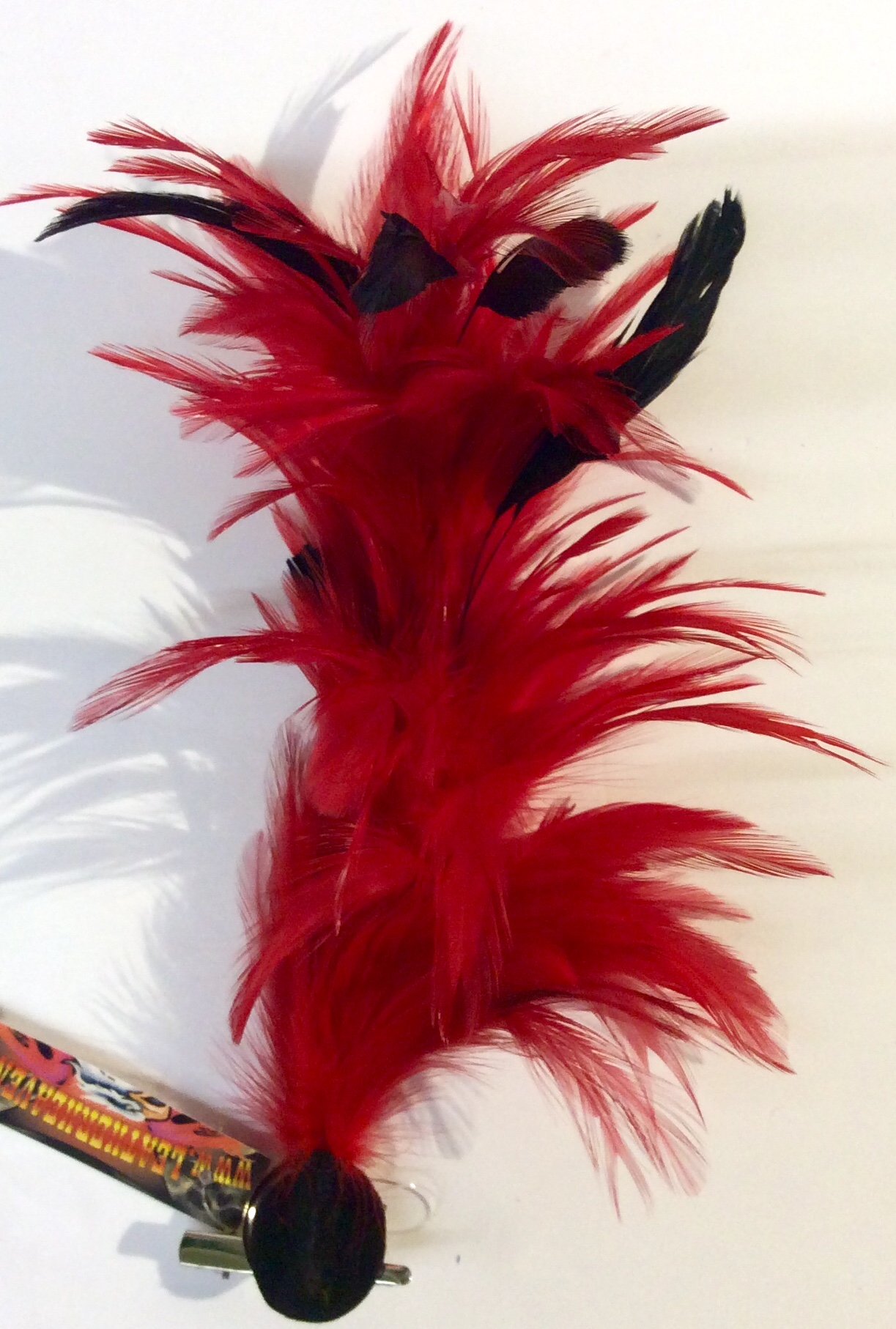 Sulka hiusklipsi/rintaneula, Punainen . Punainen sulka hiusklipsi/rintaneula. Hiusklipsin sisällä rautalanka, jonka avulla sulan saa muotoiltua suoraksi, pyöreän muotoiseksi, pään muodon mukaan. Klipsin koko pituus sulka suorana 29 cm.