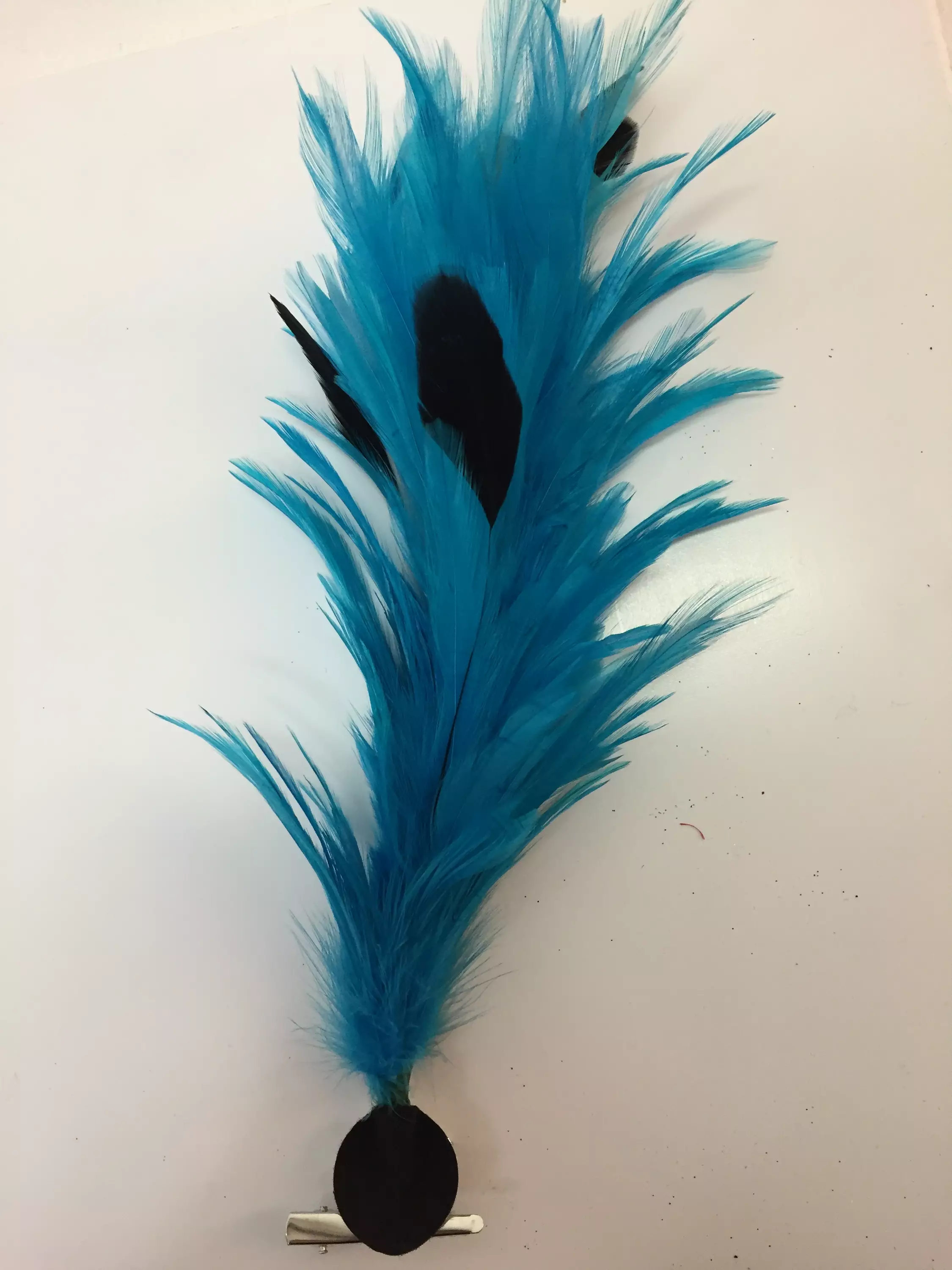 Sulka hiusklipsi/rintaneula, turkoosi. Upealla sulkaklipsillä näyttävyyttä kampaukseen. Klipsin saa kiinnitettyä helposti myös vaikkapa vaatteeseen. Lisäksi klipsin alla myös hakaneula, joten sulkaa voi käyttää rintakoruna. Metalliklipsin pituus 4,5 cm ja sulkakoristeen pituus n. 28 cm.
