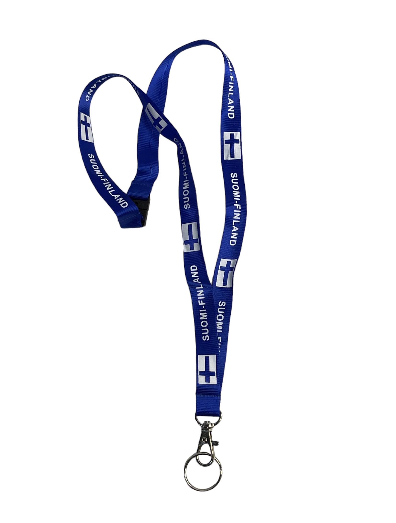 Suomi kaulanauha 15 mm x 80 cm. Kaulaan ripustettava avaimenperä, sinisessä nauhassa teksti Suomi Finland. Nauhassa avautuva turvalukko, sekä papukaijahaka, jossa avainlenkki.