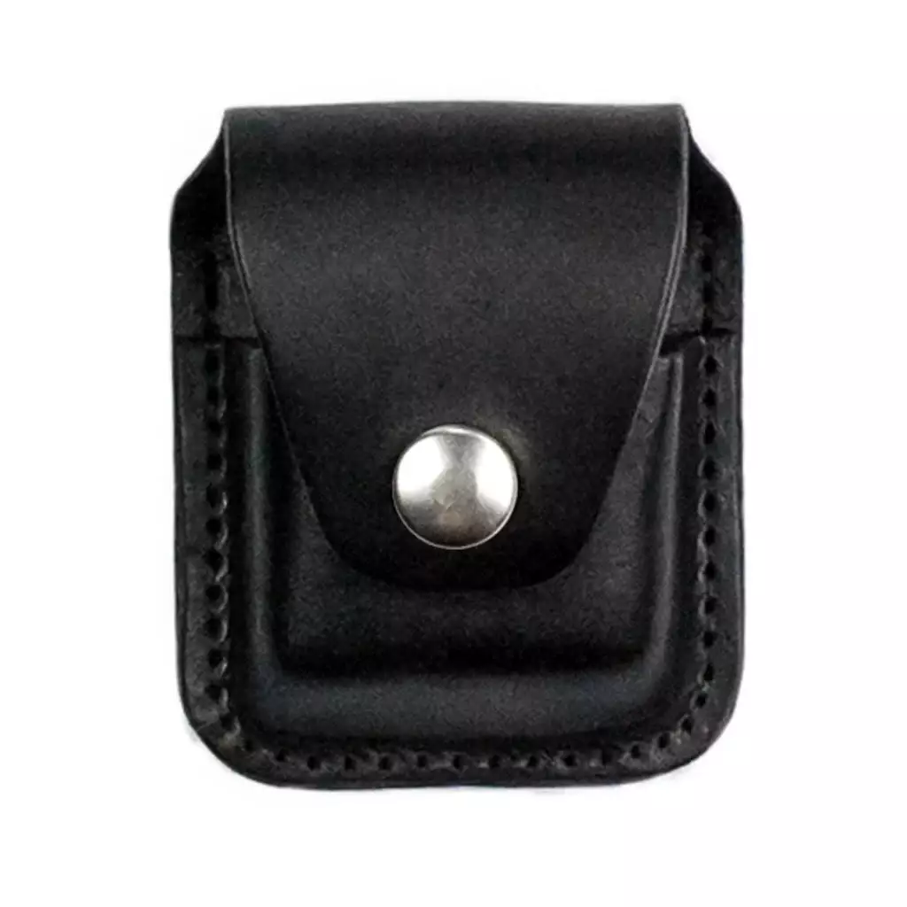Sytytinkotelo musta nahka, Mascorro. Nepparilla suljettava nahkainen sytkärikotelo. Saa kiinnitettyä vyölle kotelon takana olevan, nepillä avattavan lenkin avulla. Kotelon ulkomitat 6 x 7 x 2,5 cm.